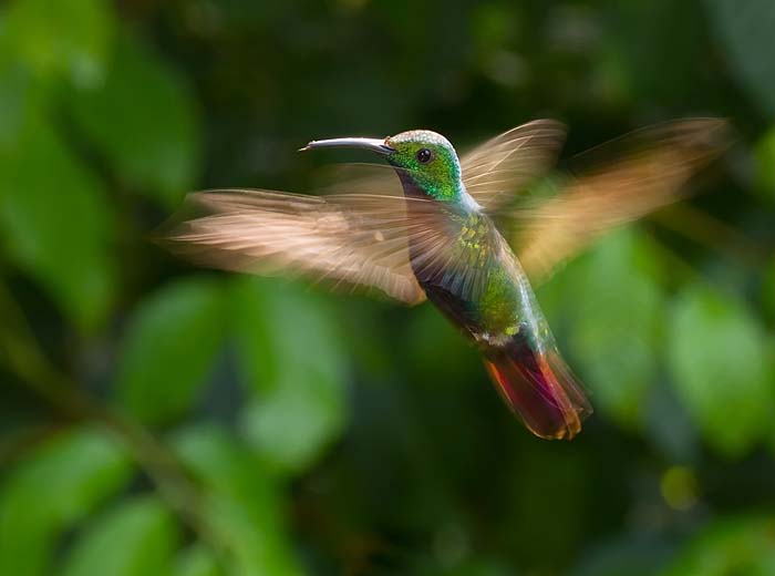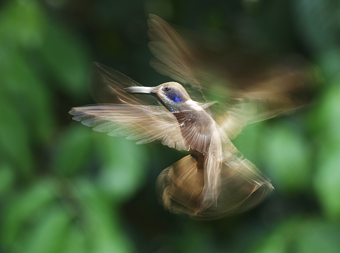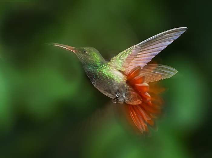 Another technique that Greg Basco suggested is to use a longer flash duration to get a little blur in the fastest moving parts of the hummingbird, the tips of the wings. In one setup we set the flashes to 1/8 power which froze the image of most of the bird. These two images were taken at f25 and using multiple flashes as the main light. In another setup where full sunlight was lighting the bird and background, the camera was set for a longer exposure to let the moving parts blur quite a bit, and the light from the flashes freezing a portion of the bird that did not move much. This had a lower success rate. The last three images were take at 1/25 second and f8. You can see the amount of wing motion in that short amount of time.
