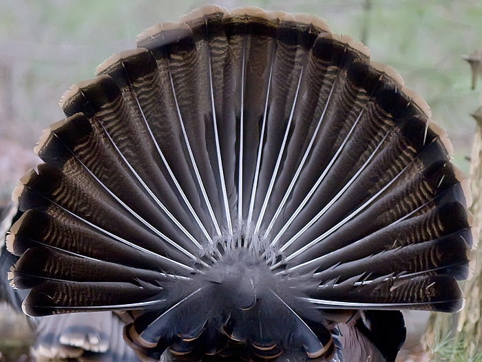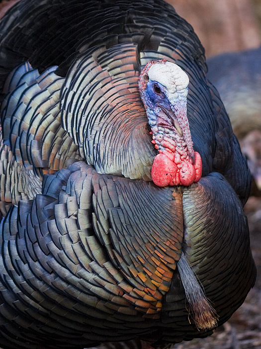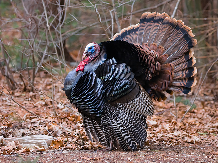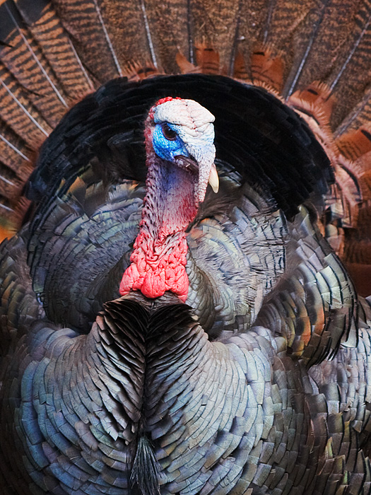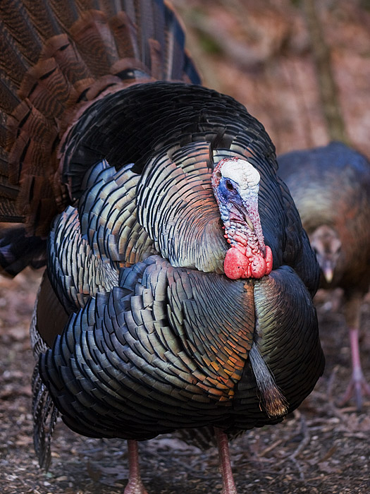 The colors on their heads changes dramatically when they are displaying, with vivid blues, a whte cap on top of their head, and bright red neck. the colors in their feathers are spectacular in the morning light. The male puffs up its feathers, spreads his tail and extends his wings down to the ground. He also angles his tail so that it shows in the direction of the females (or to potential rivals) to show how big and flashy he is.