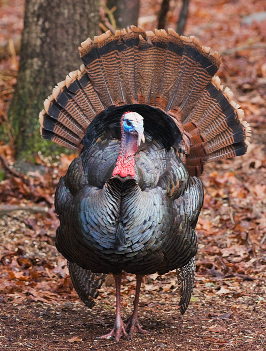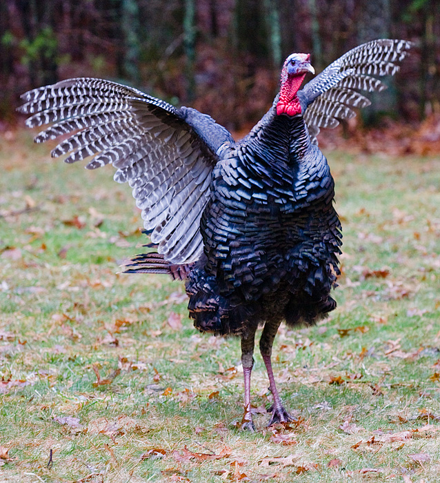 After seeing only male turkeys in our yard over the winter, the big males have gathered up their harems and are displaying to impress females, and to chase off any portential rivals. There are eleven turkeys in the group that visits reguraly, one big male, a couple of juvenile males, and seven females.
