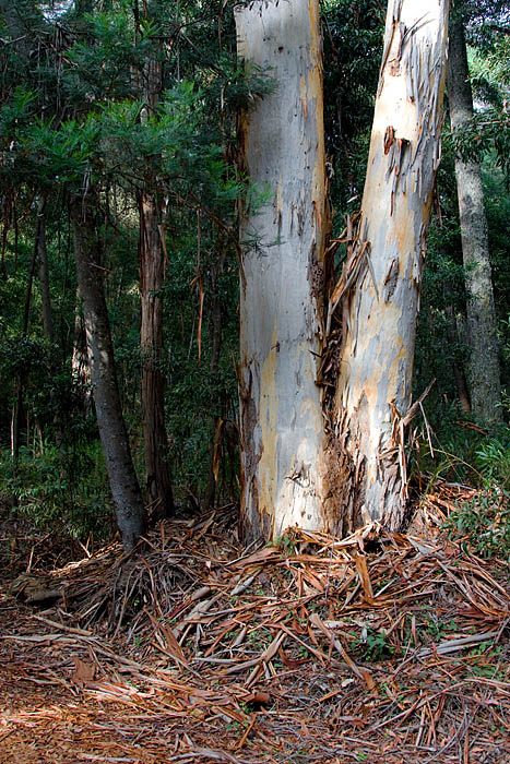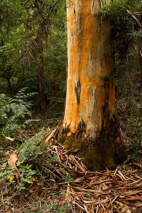 The karri tree grows only in South West Australia and is one of the tallest trees in the world. A hardwood tree growing to 90 meters in height, it sheds its grayish bark each fall leaving a pile of shredded bark at its base, revealing smooth new bark in patches of white, yellow, and orange. The trunk extends straight up and has branches only near the top.