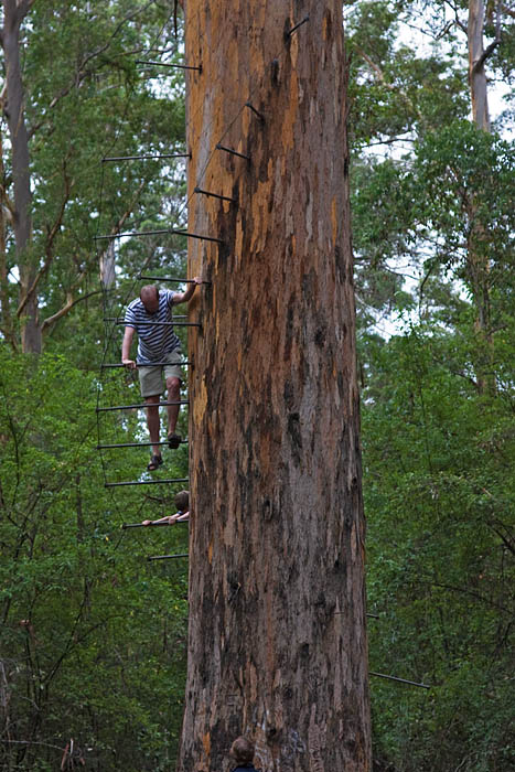 Several of these trees have been put into service as fire towers by building platforms near the top made accessible by ladders attached to the trunk. Several trees have also had these ladders installed to permit access by the public. As there is only one ladder on the trunk, people descending must pass those ascending the tree. Not for me.