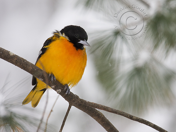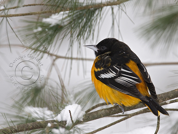 On December 20, 2008, we had a snowstorm that dropped 10 inches of snow in our yard. Since we feed the birds a variety of foods, we attract a large variety of birds that say over the winter. Not only do we get the typically wintering birds such as Blue Jays, Chickadees, Cardinals, Juncos and Titmouse, we also have a resident Carolina Wren and a Northern Oriole which stay for the winter. I believe the oriole is the same one that stayed last winter as it has learned to eat the variety of food we put out; peanuts, bread, and seeds from the feeders. Orioles are insect feeders and have a soft bill so cracking seeds is not an option. This one has figured out, or learned by watching the others, how to perch on suet feeders as well as the tube feeders hanging in the yard.