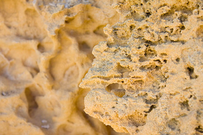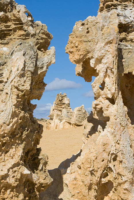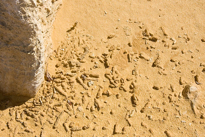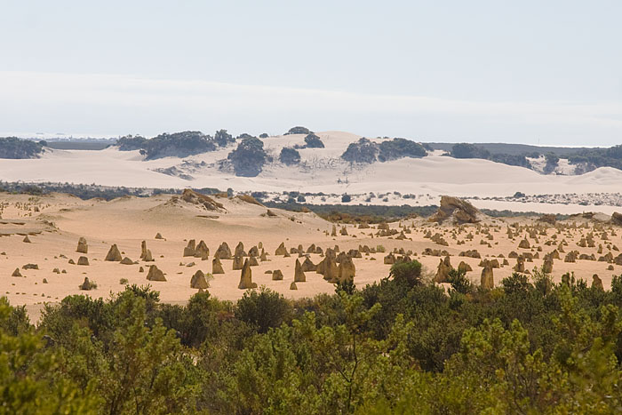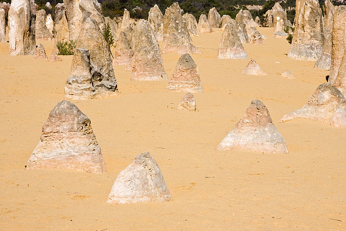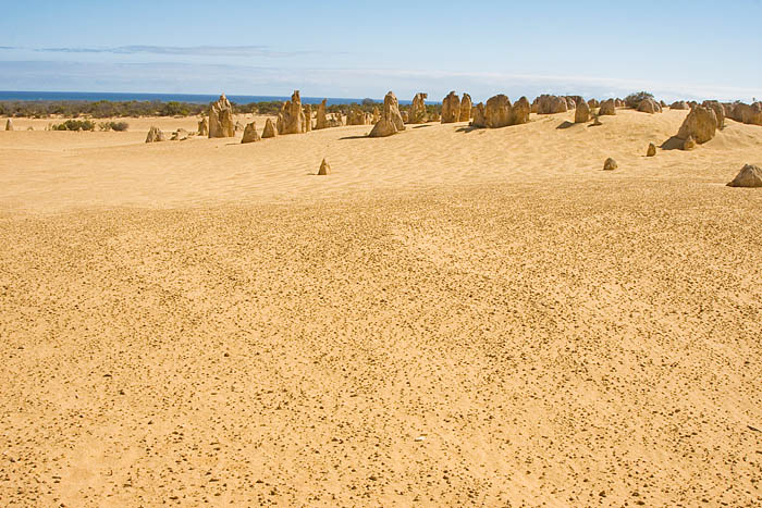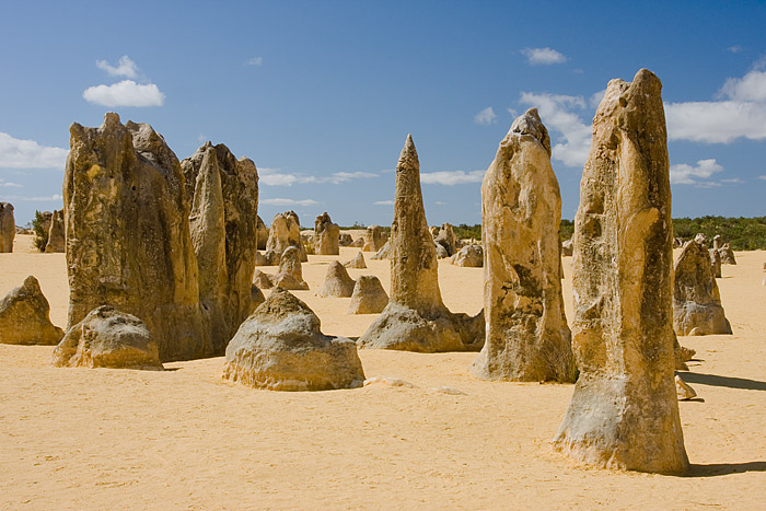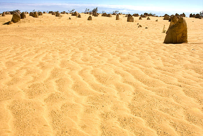 Nambung National Park is a three hour drive along the coast 245 km north of Perth. Within the park is the Pinnacles Desert, an area of yellow sands and limestone outcroppings. Thousands of stone pillars stud the area, some up to 12 feet high. Starting as an area of sand dunes blown inland from the beach, rain water leached lime from the sand near the surface and concentrated in lower levels of the dune, cementing the sand together into limestone. The pillars were a result of a hard crust of calcrete that formed over the top of the limestone. Water seeped through cracks in the crust and further dissolved the limestone leaving columns of harder limestone under calcrete caps. Winds blowing the sand away exposed the columns we see today.