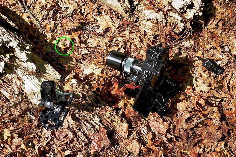 By watching the monitor that I have flipped around to be facing me as I block the sun, I am able trigger the capture with the wireless remote when I am certain I am in the correct position. In the second image above, you can see the pine tree seedling in the green circle, the receiver of the wireless remote is on the ground to the right of the camera. To the left of the camera is a Litra Torch LED light on a Platypod Ultra, spigot adapter and small ball head. Before turning on the light, I made a few captures for comparison. The resulting image (below, left) has a nice even light to it, But the upper right quarter seems a little brighter than the rest of the scene. I feel my eye is being pulled from the seeding and to the upper right, but there is nothing significant there.