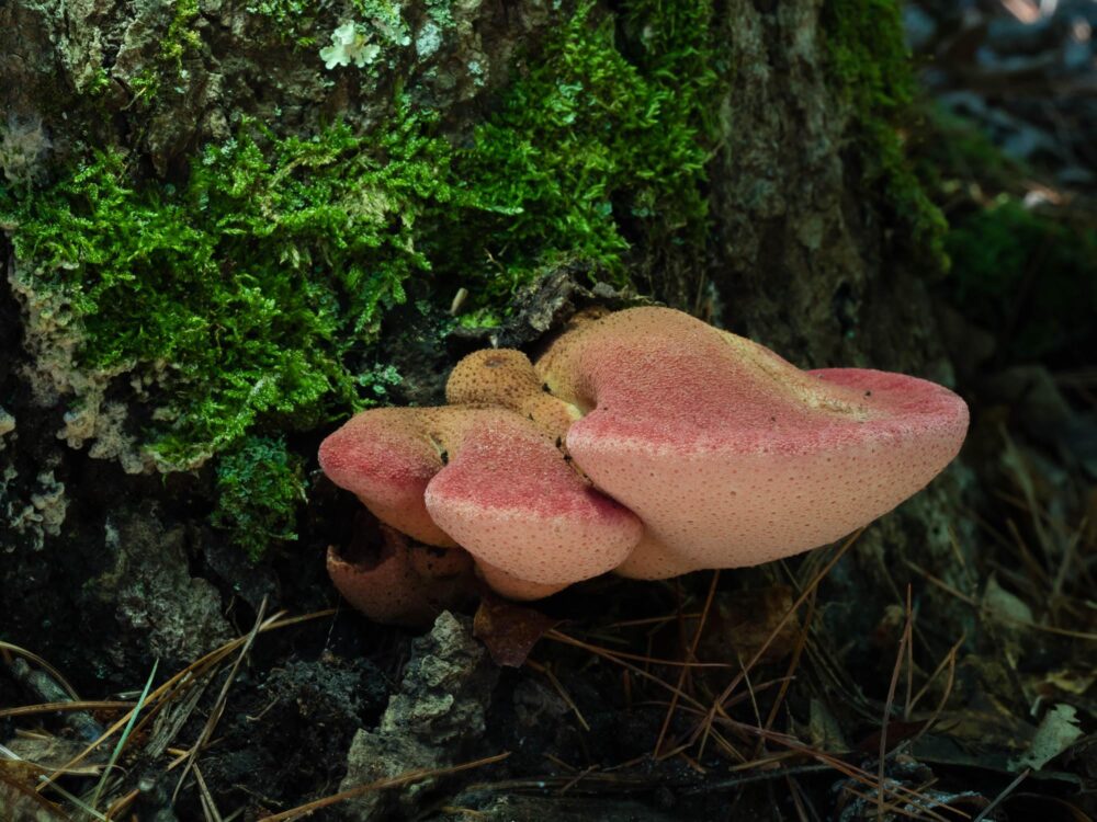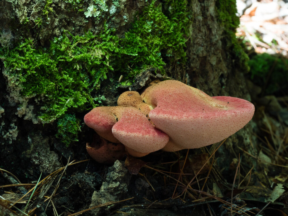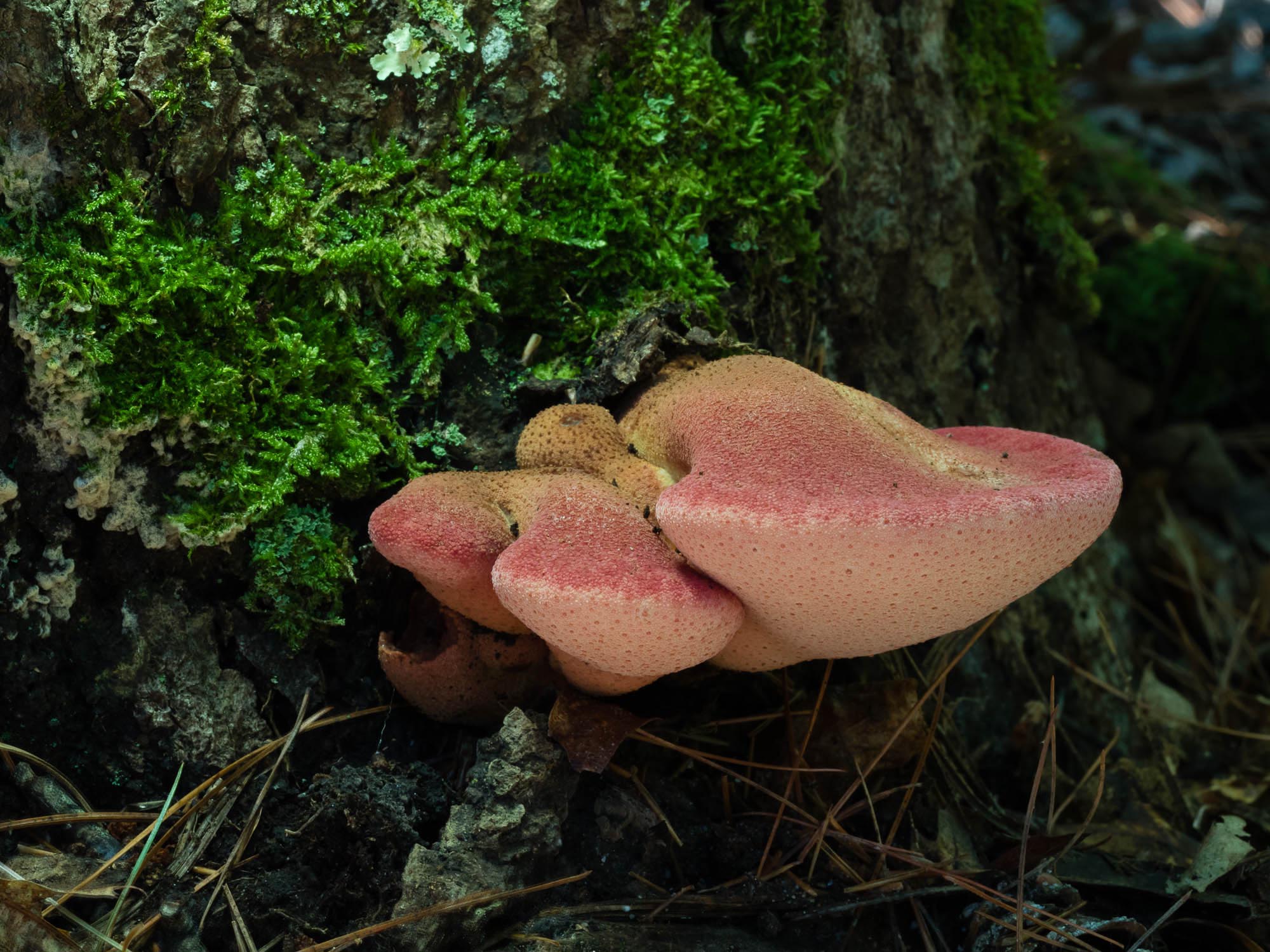 For the red fungus growing on the side of the tree stump, the offending sunlit spot is to the far right of the subject. I set up the camera with the screen flipped around so that I could see it, stood behind the stump and held my hat in the path of the sunlight so that I cast a shadow in the correct location. In this case I also added a Litra Torch to the left side of the stump to light the underparts of the fungus.