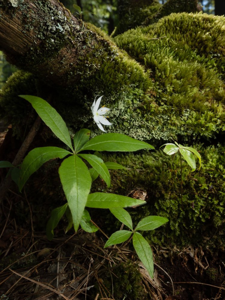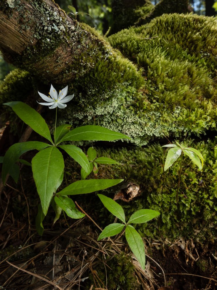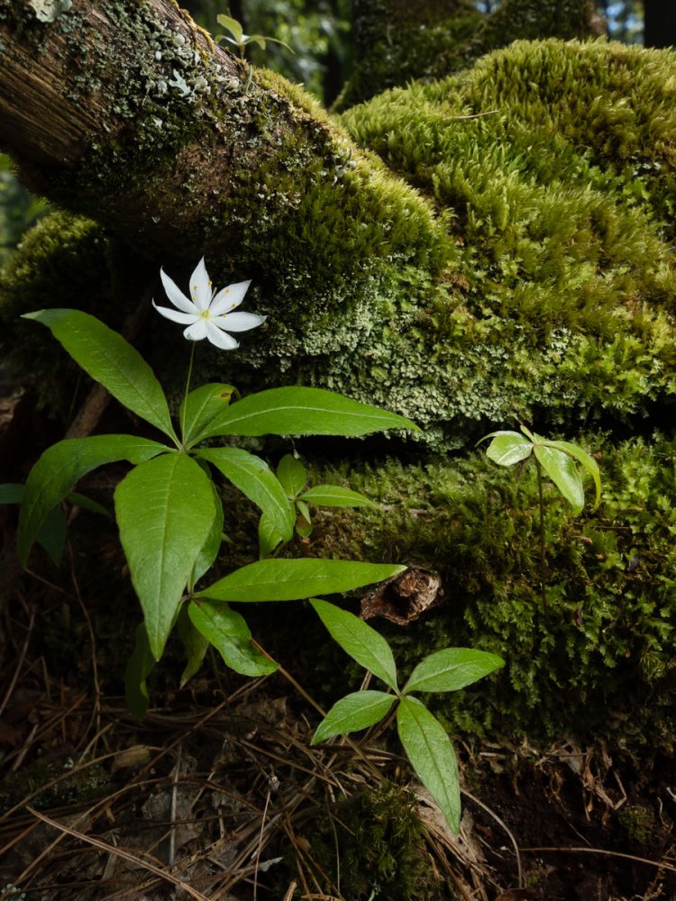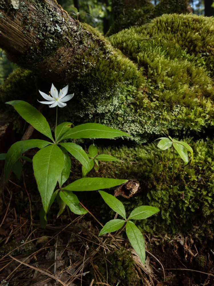 On occasion, I find a composition I like, but the brightness of the foreground and the background are so different that a single capture is difficult. I find it best to get the image captured with the least amount of processing anticipated. In this example, I have a starflower; a small white flower next to a moss-covered fallen tree. To complicate matters, a breeze is blowing the flower around, at times quite a bit. It is in the shade and the background is lit by the sun.