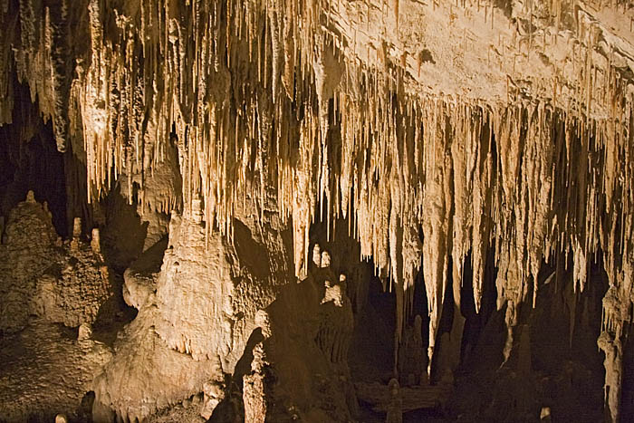 The caves are quite beautiful, lit as they are with yellow and reddish lights. Using flash revealed the true color to be more whitish or grey, what would be expected for limestone. Thin tubes are formed as mineral laden water drips through a tube, adding material to the end of the tube. In Lake Cave, the main feature is actually suspended above the surface of the water. The base was originally attached to the bottom of the cave lake, which was dissolved over time and lowered.