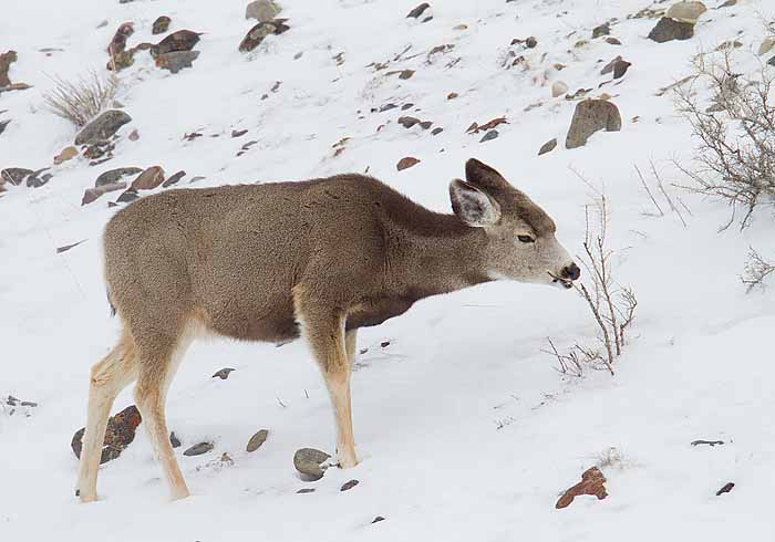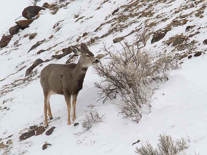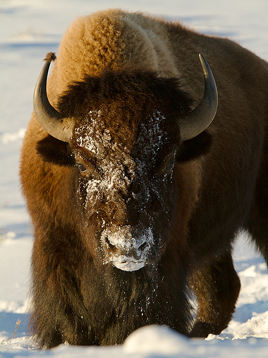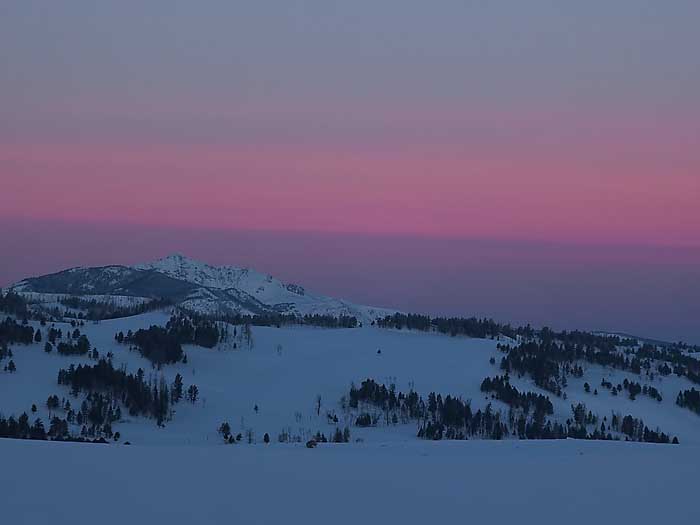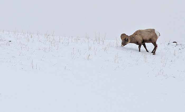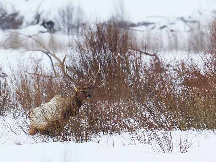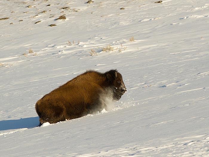 When I pulled over to the side of the road, both passenger side wheels slid off the pavement into the soft snow and I couldn’t move the four-wheel drive Jeep Cherokee forward or backward. The road is kept plowed, sometimes daily to clear off any drifting snow. Although there are markers along the road, the edge of the pavement is hidden from view by the thin layer of snow there, and if the plow goes beyond the paved area, there is no way to know. The plows extend beyond the wheelbase of the truck so they can plow a larger path. Luckily, the folks in Montana are helpful and someone stopped right away even though he had a small car and no tow strap. We both tried our cell phones, but no coverage out in the middle of nowhere. The next pickup truck stopped and the driver had a tow strap and indicated he would turn around and be back shortly. I crawled under the Jeep and it figures there are no tow points on a Jeep. I found something sturdy on the rear axle assembly to attach the strap and he was able to drag the Jeep back onto the road. I was extremely grateful for the help. I figured I had enough excitement for the day as it was late afternoon and headed back to Gardiner. Just up the road I stopped to chat with Daniel Cox and Randy Kokesch who had come down to photograph in the Lamar Valley for the day. After carefully parking in a pull out, I told them my tale of woe, we compared notes, and I went on my way as the light was getting dim and they were heading back to Bozeman.