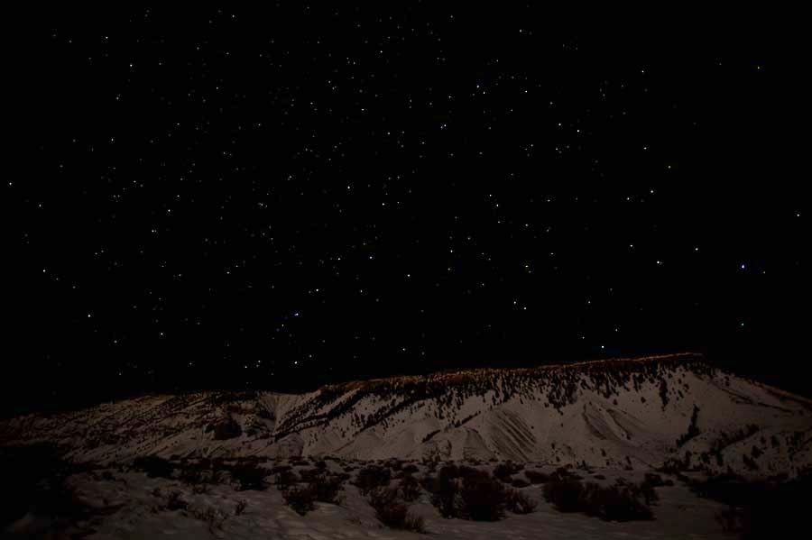 Since I arrived in late afternoon, I decided to check the road conditions and get a feel for the locations I could safely stop the car to photograph and went for a quick reconnoiter into the park after checking-in at the hotel. Bison where close to the road, and with little traffic I stopped to photograph one group of bison eating grasses under the snow. One had a small tuft of fur on the end of one of its horns, probably a remnant from an altercation with another bison. I saw one bison run uphill through chest deep snow and took a series of photographs, not even thinking to switch to video. I caught a sunset from one of the viewpoints. After dinner in Gardiner, I returned to a pull out just before the Gardiner River Bridge to photograph the night sky. The sky was cloudless and full of stars and a low crescent moon provided enough light to see the hillsides. It was plenty cold, about -10o, and I worked fast to take a few images. The best results were taken at the 17mm, ISO 800, f4 at 30 seconds. The trail of the stars was barely visible when viewed at 100%. With the 50mm lens, the track of the stars was evident and not usable at over 20 seconds. It’s hard to focus through the viewfinder, and I resorted to using live view and increasing the ISO until I could focus, then reducing the ISO down to 800 to capture the image.