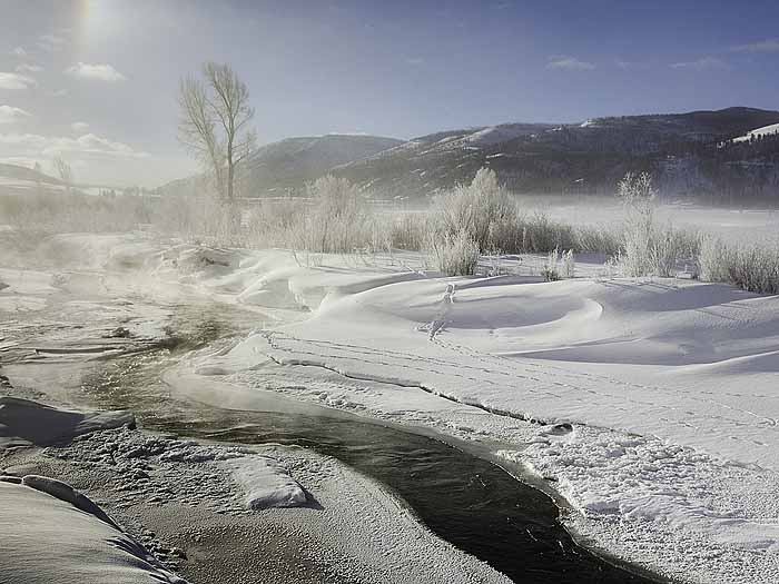 The next day started cold; at -27o it was the coldest day on this trip. The cold weather presented some interesting environmental conditions for exposure (photographically speaking). I didn’t feel it was too cold to work, as the car was never that far away. I did have to use gloves, and the layered clothing was comfortable enough. My strategy for shooting in the park was to drive the road between Mammoth Hot Springs and Soda Butte Springs at the end of the Lamar Valley and possibly beyond, stopping when something good caught my eye. The sunrise was below the nearby hills when I saw the first sundog, a refraction of sunlight through ice crystals similar to a rainbow. The low cloud of ice crystals near the ground was brightly lit up with the sunlight, and in the middle was a bar of color. I couldn’t see where the sun was rising over the horizon as it was behind some nearby hills. Not wanting to waste the opportunity, I made several sets of exposure for HDR processing as the brightness range was too wide to capture in one image. Then I drove ahead to try to see if there were sundogs on both sides and if there was the possibility of a decent image of the sunrise. It was obvious that the sun was well above the horizon and I took advantage of a location that had the sun behind a hill, otherwise the sun would have been too bright to capture the effect. As I entered the Lamar Valley I was able to capture the image of the southern sundog well above the horizon. The very low temperature of the air and the steam rising off the much warmer water of the Lamar River resulted in the trees and bushes being covered in frost. I returned to Gardiner to pick up lunch, stopping along the way to photograph the Gardiner River. There are paths and boardwalks that lead into the lower terraces of Mammoth Hot Springs; the low temperatures here resulted in great amounts of steam rolling off the hot water of the terrace. A wide view was nearly impossible to capture although by waiting for a clear break in the steam I was able to make a few good image of the “ghost” trees at the top of the terrace. The more intimate landscape images reinforce how cold it was, with layers of frost on the dry structures adjacent to those with hot water in them. Another trip down the road yielded a few coyote images taken at long range with a 500mm and 2X extender. This drive was mostly uneventful as I arrived at Soda Butte Creek parking area, turned around and headed back to a spot where I had seen two coyotes on the hillside.