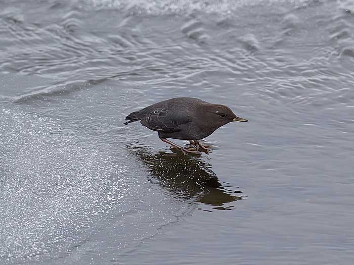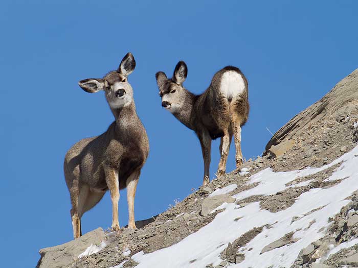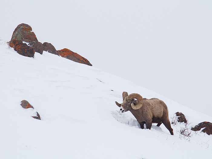 My second full day in northern Yellowstone was much the same as the first day, except that it was much, much warmer, in the 30s. Photographing at the lower terraces offered a clearer look at the mineral deposits as the amount of steam was greatly reduced. Two trips between Mammoth Hot Springs and Soda Butte Creek yielded a few scenics, good views of an American Dipper, black-tailed deer, elk, and bighorn sheep. On the first trip I found a traffic holdup near the Lamar Ranger Station; a dump truck with a plow had gone off the edge of the road and was settled at a precarious angle. I felt a lot less foolish than I did the day before for doing the same thing.
